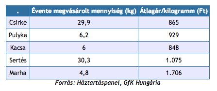 A GfK Hungária háztartások privát fogyasztását monitorozó Háztartáspanel adatai azt mutatják, hogy a 2012. július és 2013. június közötti időszakban kilogrammonként átlagosan 865 forintért beszerezhető csirkehúsból évente mintegy 14 alkalommal vásárol egy háztartás alkalmanként 2,2 kilogrammnyit. Az egyéb szárnyasok közül volumenénél fogva fontos kiemelni a pulyka-, valamint kacsafogyasztást, melyből közel azonos, 6 kilogramm körüli mennyiséget szerzett be egy-egy vásárló háztartás a fent említett időszakban. A valamivel alacsonyabb átlagáron elérhető kacsahúsból ritkábban (évente háromszor) bár, de jellemzően nagyobb mennyiség (2,1 kilogramm) kerül a bevásárlókosárba, mint pulykából (évente négyszer 1,6 kilogramm).
